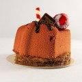 Mousse chocolat fruits rouges, biscuit chocolat, compotée de fruits rouges.